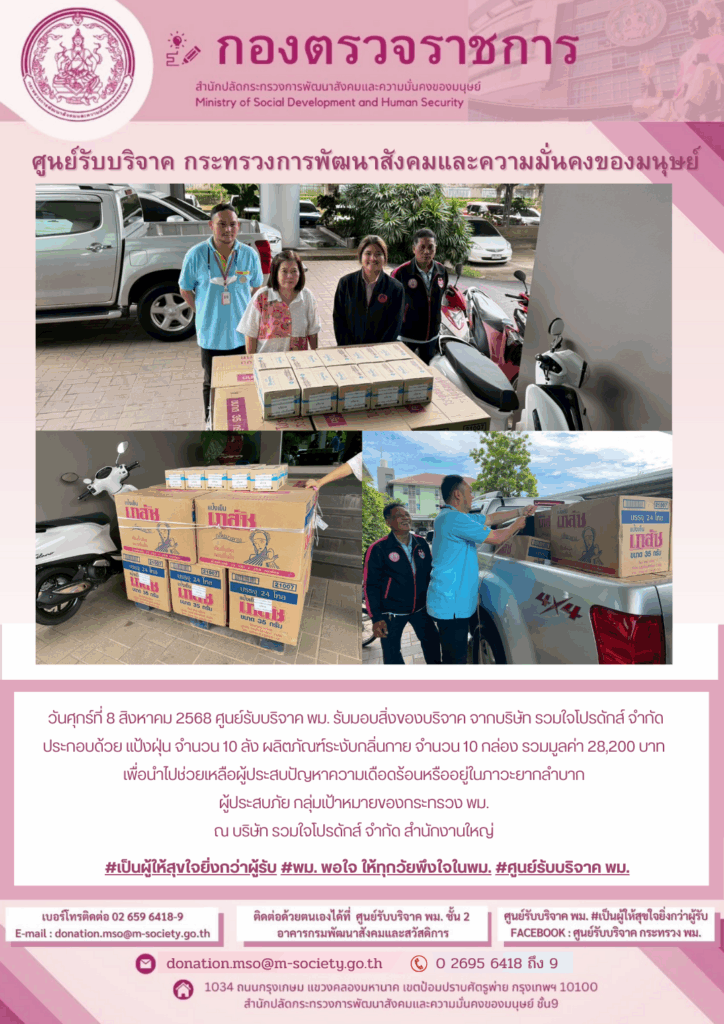 วันศุกร์ที่ 8 สิงหาคม 2568 รับมอบสิ่งของบริจาค จากบริษัท รวมใจโปรดักส์ จำกัด สำนักงานใหญ่ ประกอบด้วย แป้งเย็นเภสัช จำนวน 10 ลัง ผลิตภัณฑ์ระงับกลิ่นกาย จำนวน 10 กล่อง เพื่อช่วยเหลือผู้ประสบปัญหาความเดือดร้อน